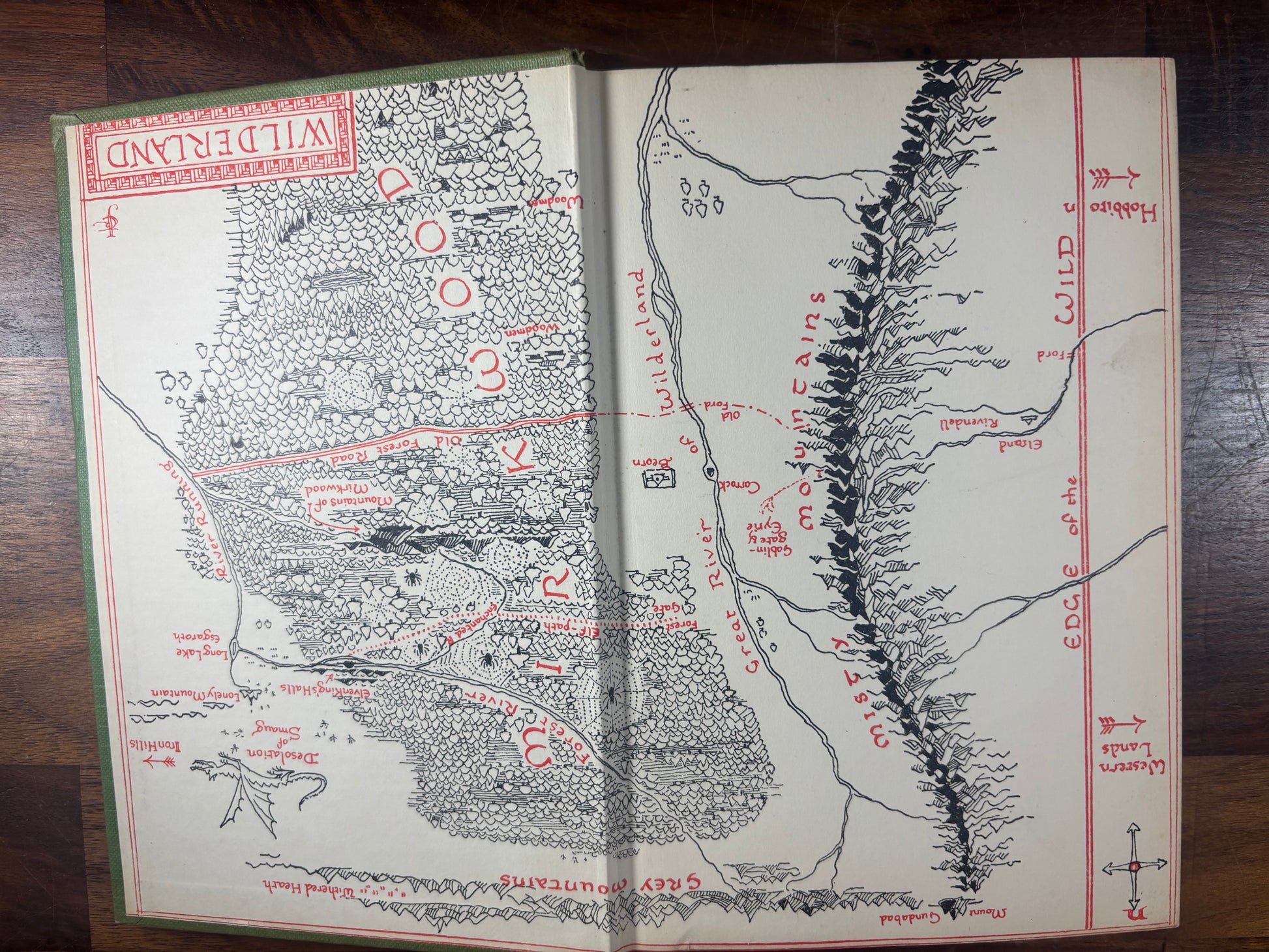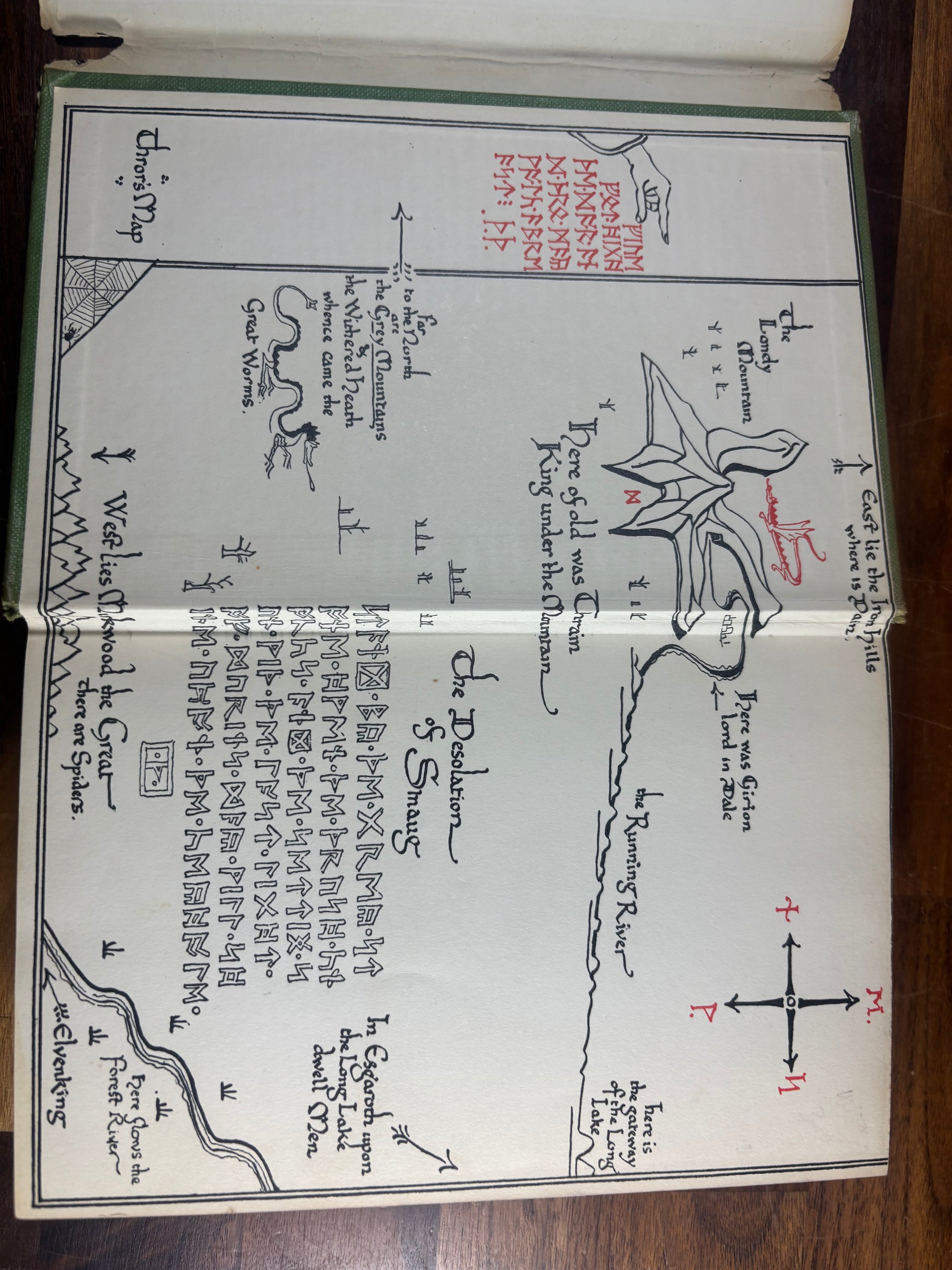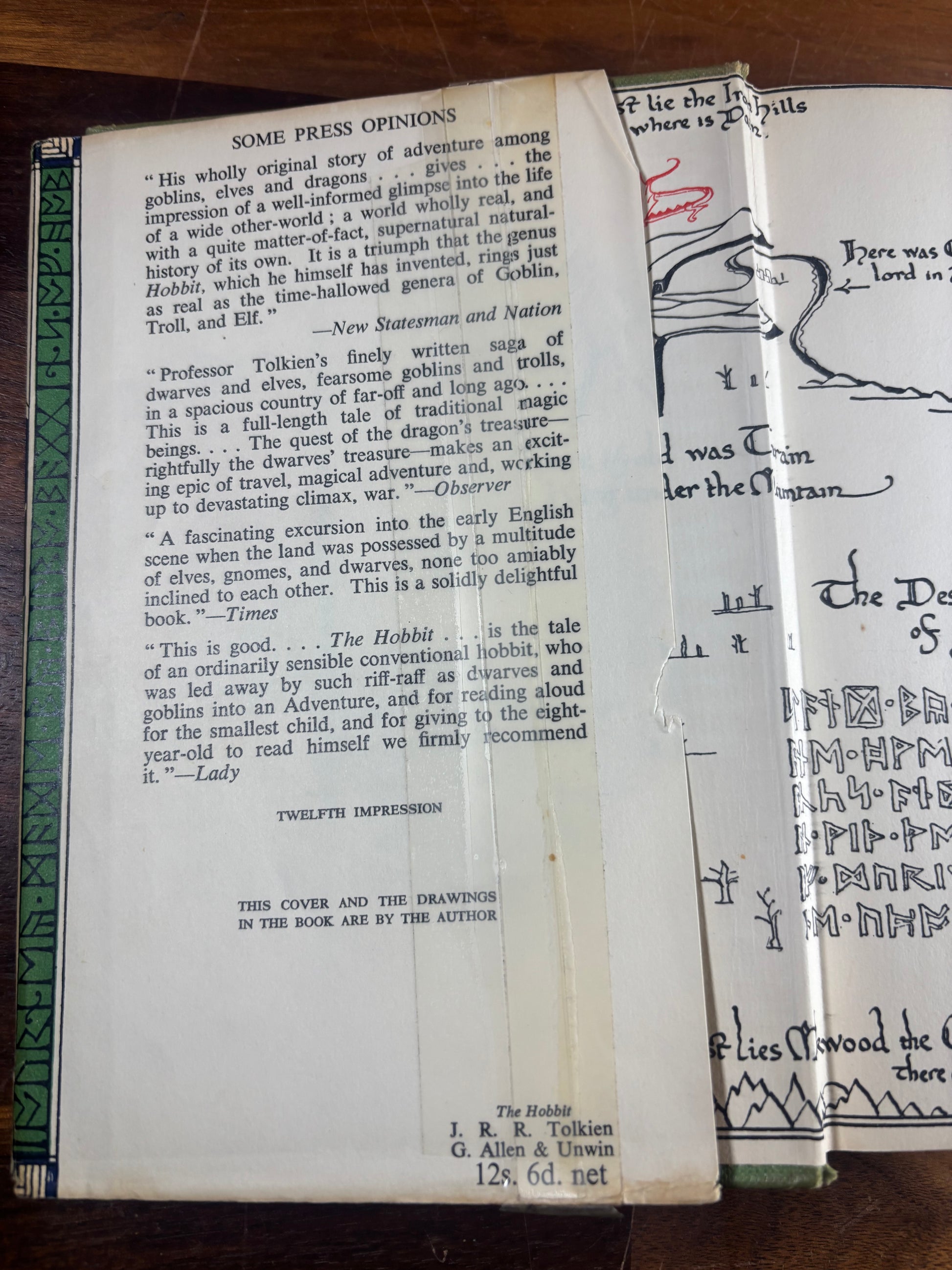 The book retains its original Tolkien-designed dust jacket, featuring the iconic mountain, forest, and runic border artwork by the author himself, a highly desirable collector feature.