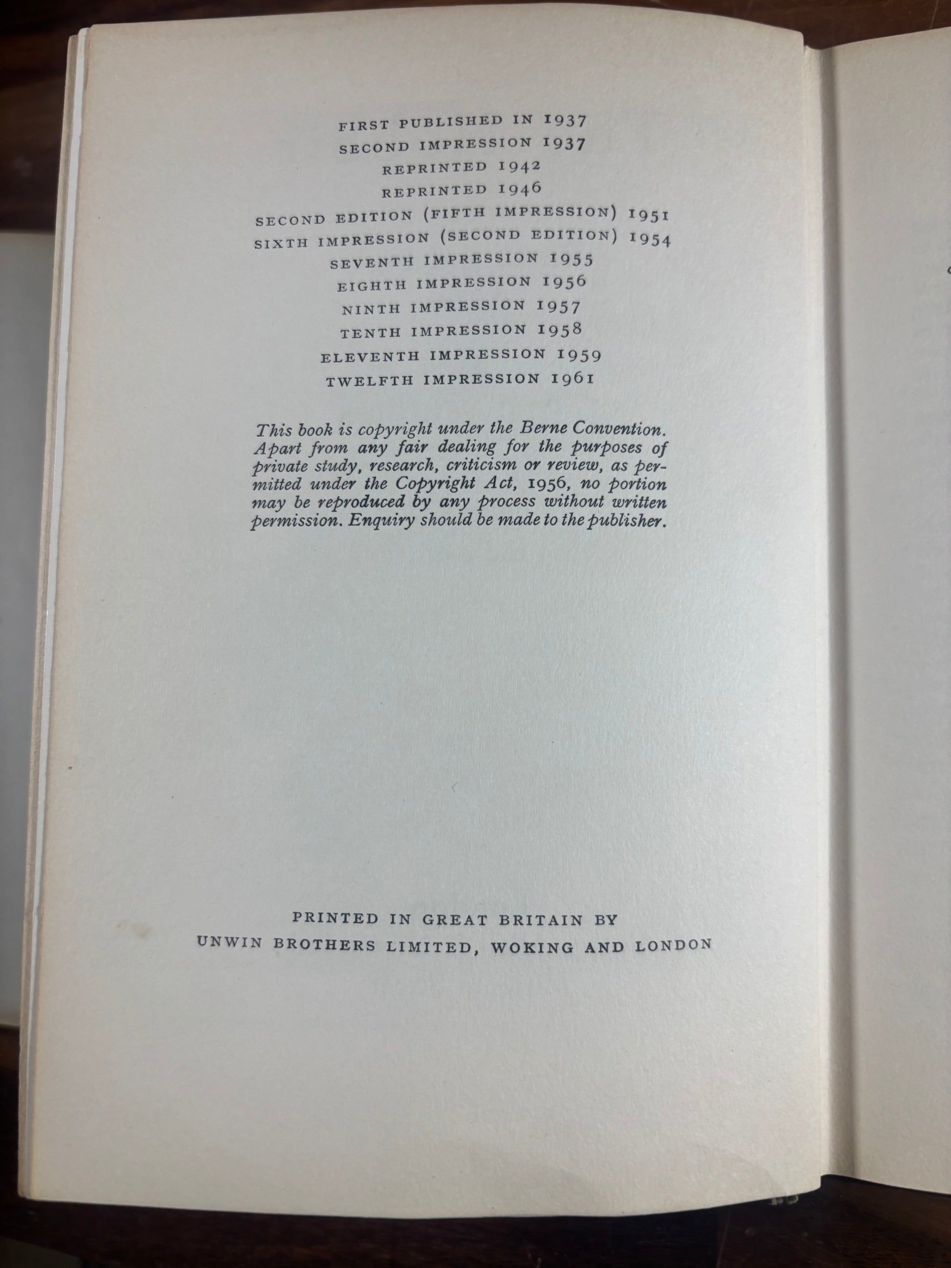 This is a genuine early UK printing, confirmed by the publisher’s imprint page listing the Twelfth Impression (1961), with the full printing history present and intact.